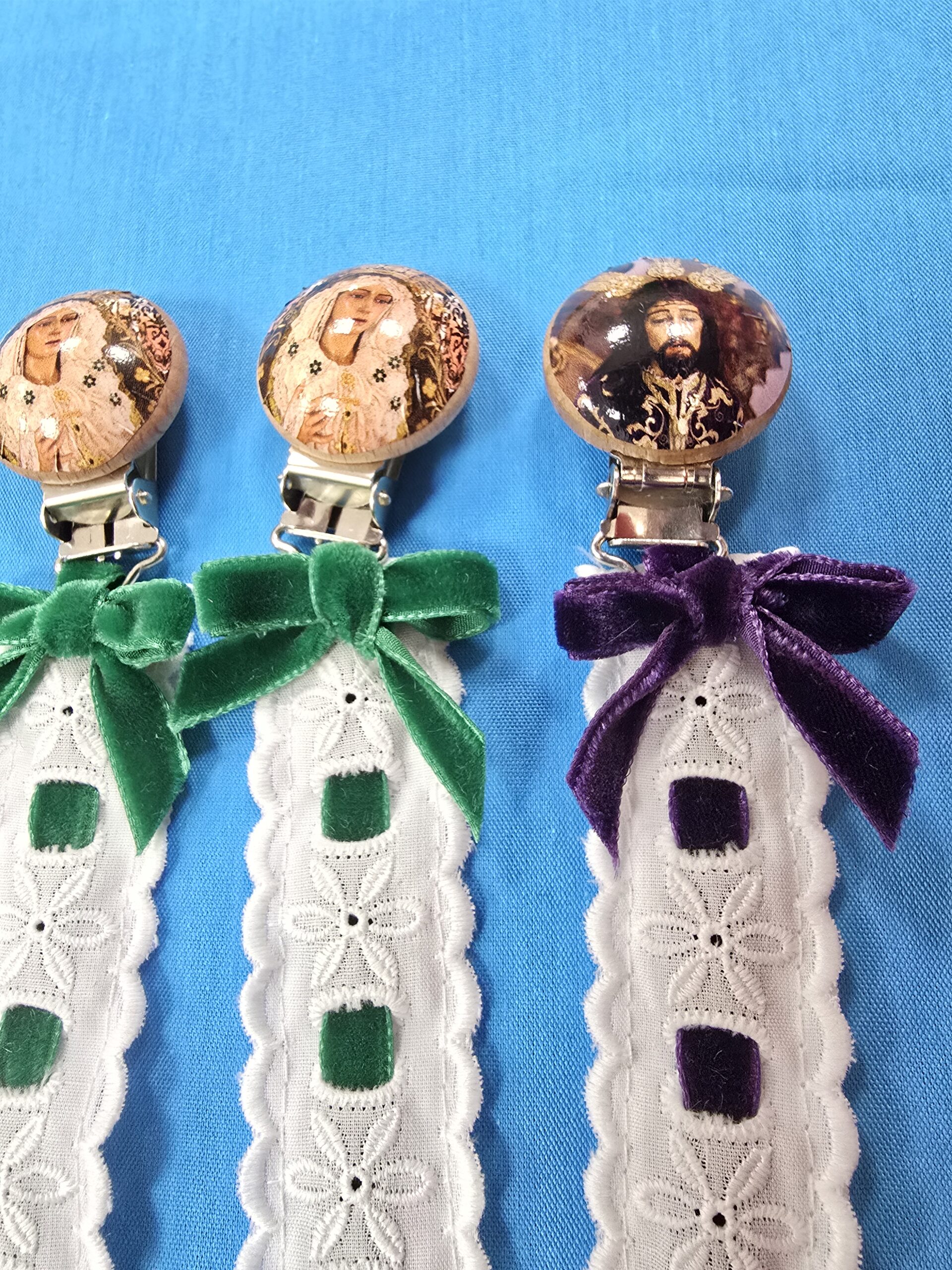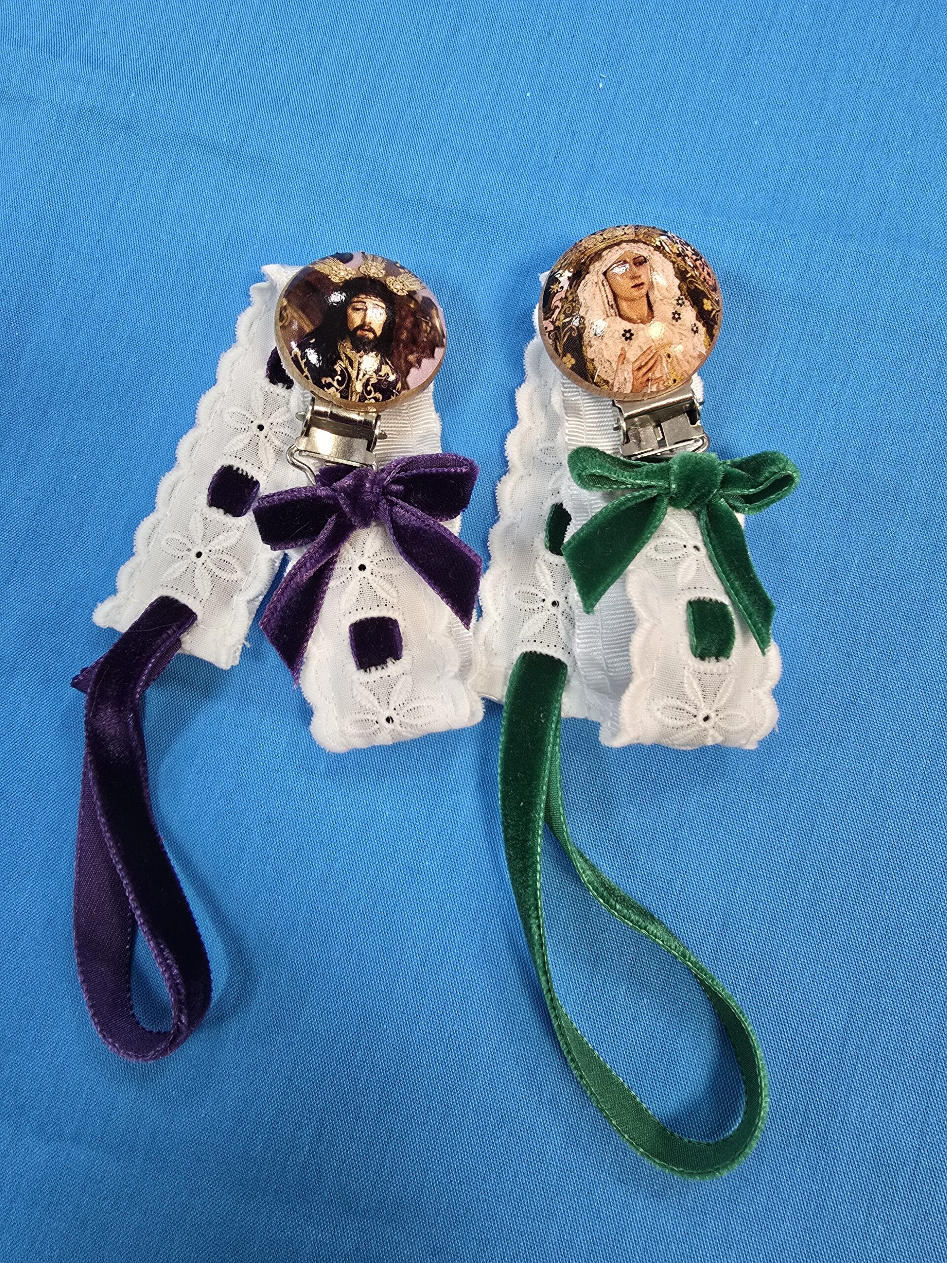 Chupeteros de hermandad personalizados, perfectos para los pequeños cofrades de la casa. Un detalle único, hecho con cariño, para que la devoción empiece desde la cuna.
